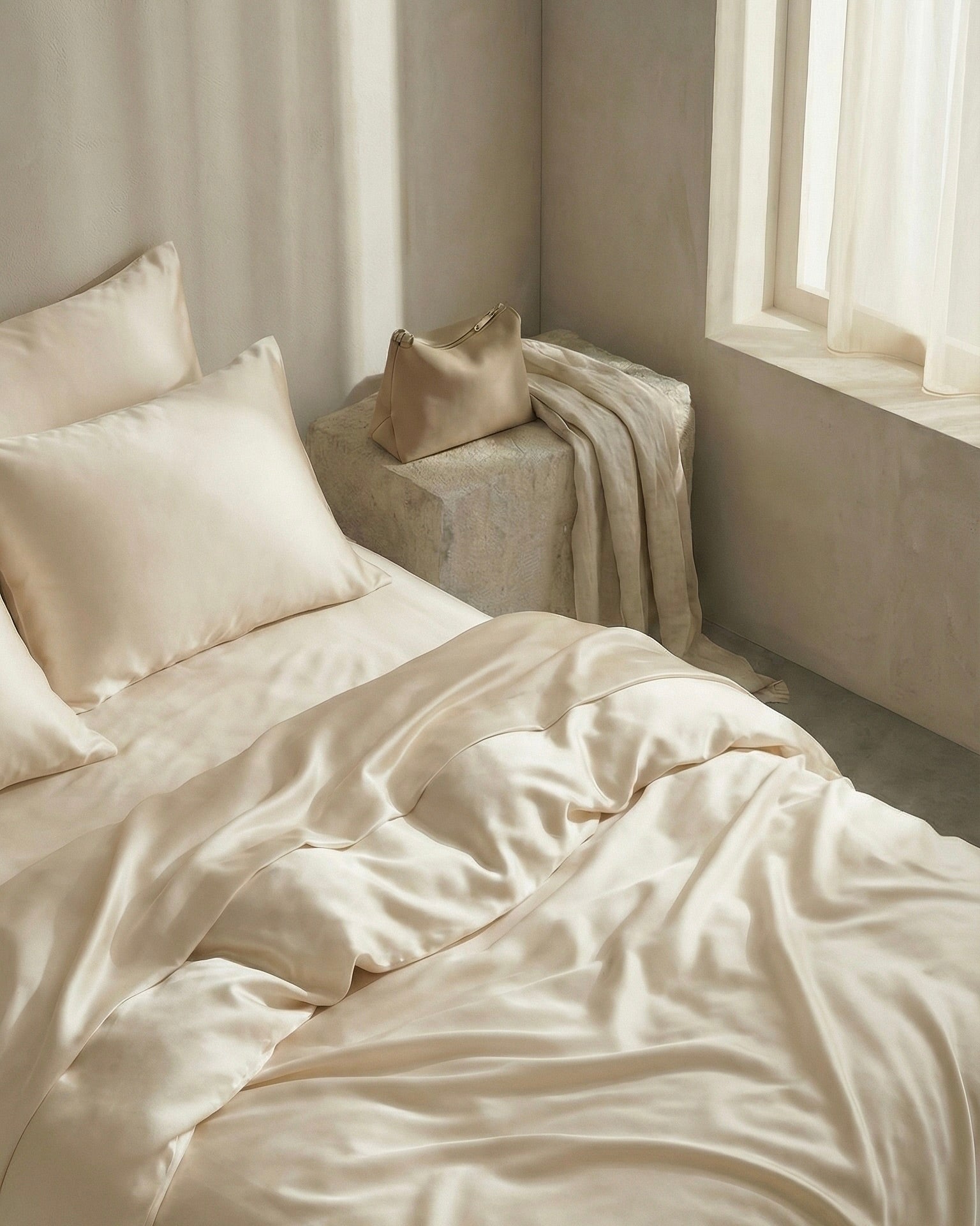 Refined over centuries, its long, continuous fibers regulate temperature, reduce friction, and protect what they touch. While other fabrics absorb, pull, and disrupt, silk preserves—skin, hair, and rest itself. Night after night, it works quietly, without wear or compromise.